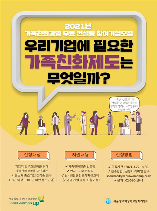 ¼¿ï½Ã´Â °¡Á·Ä£È°æ¿µ°ú ±â¾÷ÀÇ ¾÷¹«È¿À²È¿¡ °ü½É ÀÖ´Â 10ÀÎ ÀÌ»ó 300ÀÎ ¹Ì¸¸ Áß¼Ò±â¾÷À» ´ë»óÀ¸·Î °¡Á·Ä£È°æ¿µ ÄÁ¼³ÆÃÀ» ¹«·á·Î Áö¿øÇÑ´Ù°í ¹àÇû´Ù.