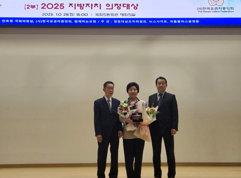 ÁÖ¼øÀÚ °ü¾Ç±¸ÀÇȸ ÀÇ¿ø(´õºÒ¾î¹ÎÁÖ´ç, ½Å»çµ¿¡¤Á¶¿øµ¿¡¤¹Ì¼ºµ¿)ÀÌ Áö³ 10¿ù 28ÀÏ ±¹È¸ÀÇ¿øÈ¸°ü ´ëȸÀǽǿ¡¼ ¿¸° ¡®2025 Áö¹æÀÚÄ¡ ÀÇÁ¤´ë»ó¡¯ ½Ã»ó½Ä¿¡¼ ¡®´ë»ó¡¯À» ¼ö»óÇß´Ù.
