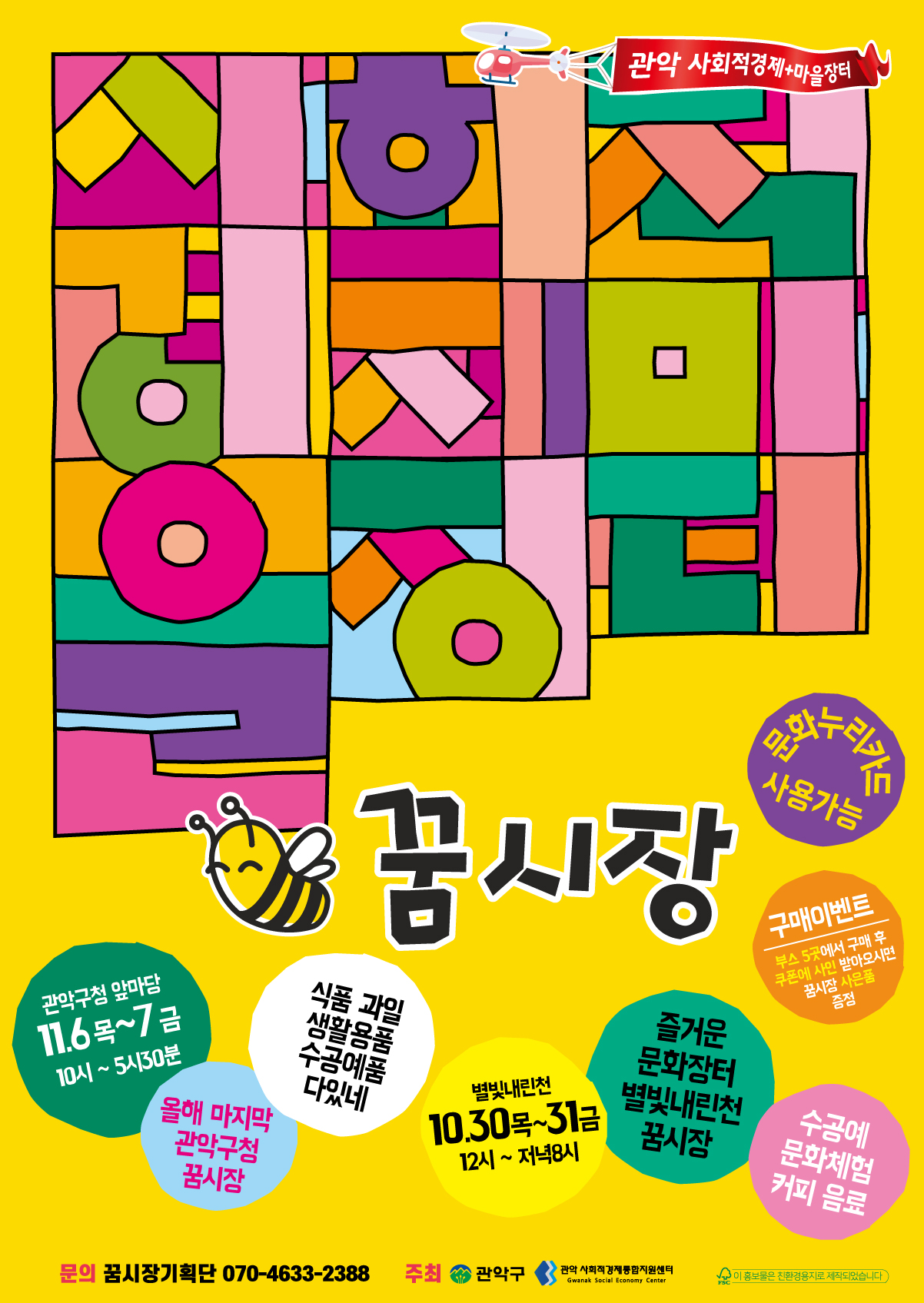 10¿ù°ú 11¿ù ¡®²Þ½ÃÀ塯¿¡¼´Â ¼ö°ø¿¹Ç°, »ýȰ¿ëǰ, ½Äǰ µî ´Ù¾çÇÑ »çȸÀû°æÁ¦±â¾÷ Á¦Ç°À» ÇÑÀÚ¸®¿¡¼ ¸¸³ªº¼ ¼ö ÀÖÀ¸¸ç, ±¸¸ÅÀ̺¥Æ®¸¦ ÅëÇØ ²Þ½ÃÀå »çÀºÇ°À» ÁõÁ¤ÇÑ´Ù. ¶ÇÇÑ, ¹®È´©¸®Ä«µå »ç¿ëó·Î µî·ÏµÇ¾î ¹æ¹®°´ÀÌ Æí¸®ÇÏ°Ô ÀÌ¿ëÇÒ ¼ö ÀÖµµ·Ï Áö¿øÇÑ´Ù.