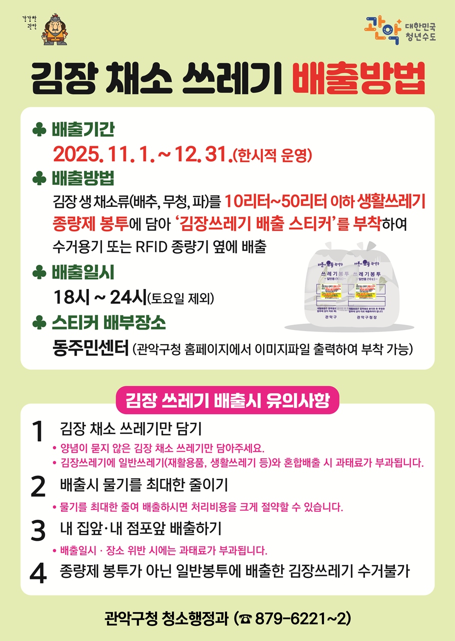 °ü¾Ç±¸(±¸Ã»Àå ¹ÚÁØÈñ)´Â ±èÀåöÀ» ¸Â¾Æ ´ë·®À¸·Î ¹ß»ýÇϴ ä¼Ò·ù ¾²·¹±â·Î ÀÎÇÑ ÁÖ¹ÎºÒÆíÀ» ÇØ¼ÒÇϰí ÄèÀûÇÑ »ýȰȯ°æÀ» Á¶¼ºÇϱâ À§ÇØ 11¿ù 1ÀϺÎÅÍ 12¿ù 31ÀϱîÁö ¡®±èÀåö ä¼Ò¾²·¹±â Ưº°Ã³¸®±â°£¡¯À» ¿î¿µÇÑ´Ù.