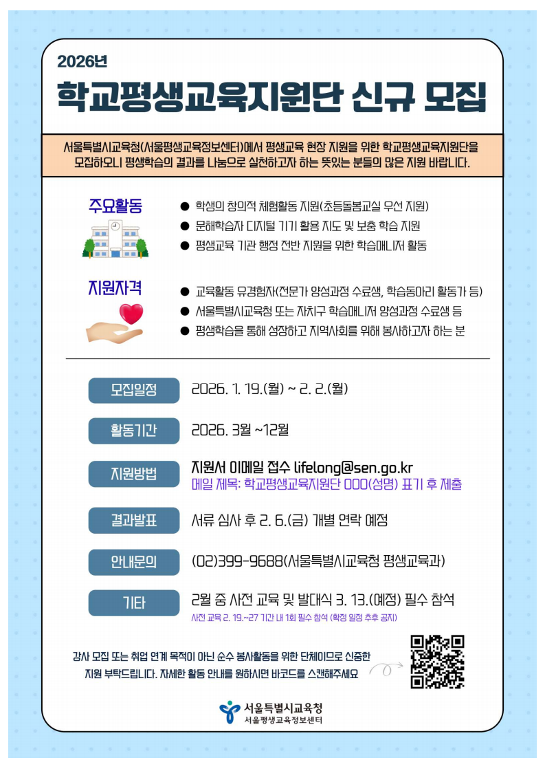 ¹Ú: ³×, ´ÙÀ½Àº ¼¿ïƯº°½Ã±³À°Ã»Æò»ý±³À°°ú¿¡¼ 2026³â Çб³Æò»ý±³À°Áö¿ø´ÜÀ» ½Å±Ô ¸ðÁýÇÑ´Ù´Â ¼Ò½ÄÀÔ´Ï´Ù. ¸ðÁý ±â°£Àº Áö³ 1¿ù19ÀÏ(¿ù)ºÎÅÍ 2¿ù 2ÀÏ(¿ù) ¿ÀÈÄ 6½Ã±îÁö 15Àϰ£ÀÔ´Ï´Ù.