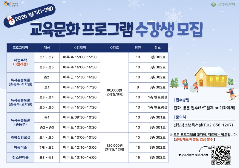 ÇÑÆí, ±¸¸³½Å¸²Ã»¼Ò³âµ¶¼½ÇÀº Áö³ÇØ 9¿ù ½ºÅ͵ðÄ«Æä °ø°£À» ¸®¸ðµ¨¸µÇØ ¿î¿µ ÁßÀ̸ç, 2026³âµµ ±³À°¹®ÈÇÁ·Î±×·¥(µ¶¼³í¼ú, ¼öÇÐ, °úÇÐ, ¹Ì¼ú)°ú û¼Ò³â µ¿¾Æ¸® Âü¿©ÀÚ¸¦ ¸ðÁýÇϰí ÀÖ´Ù. ÀÚ¼¼ÇÑ ¹®ÀÇ´Â ±¸¸³½Å¸²Ã»¼Ò³âµ¶¼½Ç(02-879-6143)·Î ÇÏ¸é µÈ´Ù.