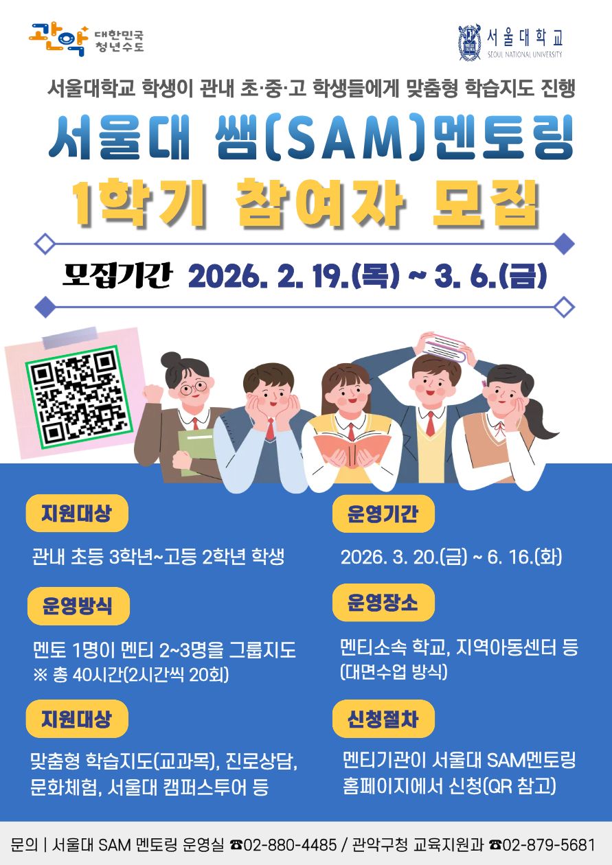 2026³âµµ 1Çб⠸àÅ丵 Âü¿©¸¦ Èñ¸ÁÇÏ´Â ±â°ü(°ü³» ÃÊÁß°í±³, Áö¿ª¾Æµ¿¼¾ÅÍ µî)Àº ¼¿ï´ë ½Ü(SAM) ¸àÅ丵 ȨÆäÀÌÁö(http://www.sammentoring.com/)¸¦ ÅëÇØ ½ÅûÇÒ ¼ö ÀÖ´Ù. ¸ðÁý±â°£Àº ¿À´Â 2¿ù 19ÀÏ(¸ñ)ºÎÅÍ 3¿ù 6ÀÏ(±Ý)±îÁöÀÌ´Ù.