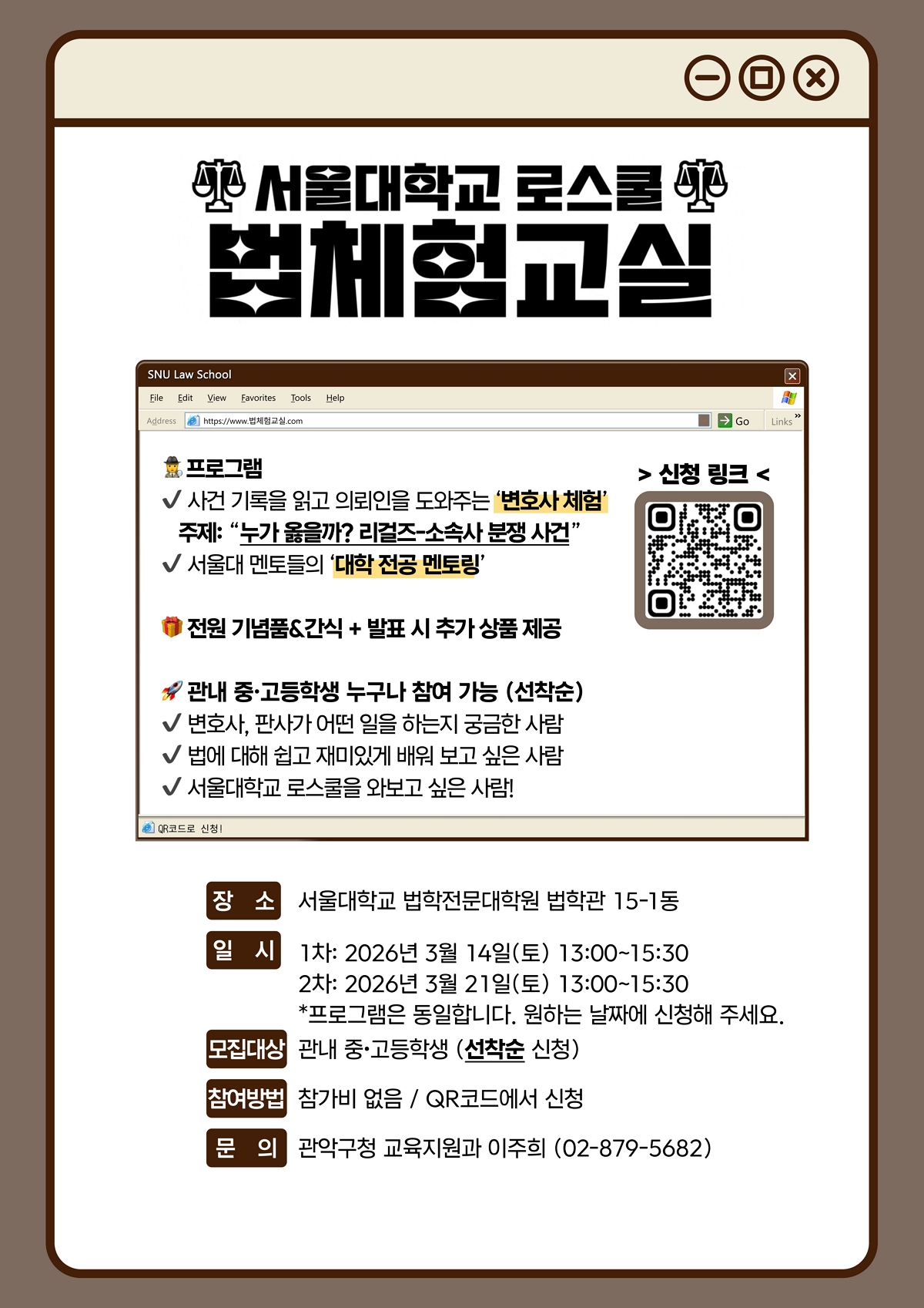 À̹ø ¹ýüÇè ±³½ÇÀº 3¿ù 14Àϰú 21ÀÏ µÎ Â÷·Ê ¼¿ï´ëÇб³ ¹ýÇÐÀü¹®´ëÇпø¿¡¼ ¿î¿µµÈ´Ù. Âü¿©¸¦ Èñ¸ÁÇÏ´Â °ü³» Áß‧°íµîÇлýÀº ¿À´Â 3¿ù 3ÀϺÎÅÍ 10ÀϱîÁö È«º¸ Æ÷½ºÅÍÀÇ QRÄڵ带 ÅëÇØ °³º° ½ÅûÇÏ¸é µÈ´Ù.