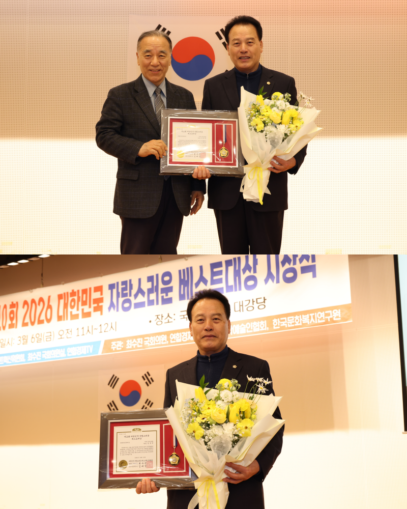 °ü¾Ç±¸ÀÇȸ ÀÓâºó ºÎÀÇÀå(±¹¹ÎÀÇÈû)ÀÌ Áö³ 2026³â 3¿ù 6ÀÏ ±¹È¸µµ¼°ü ´ë°´ç¿¡¼ ¿¸° ¡®Á¦10ȸ ´ëÇѹα¹ ÀÚ¶û½º·¯¿î º£½ºÆ® ´ë»ó¡¯ ½Ã»ó½Ä¿¡¼ ÀÇȸÀÇÁ¤°øÇå ´ë»óÀ» ¼ö»óÇß´Ù.