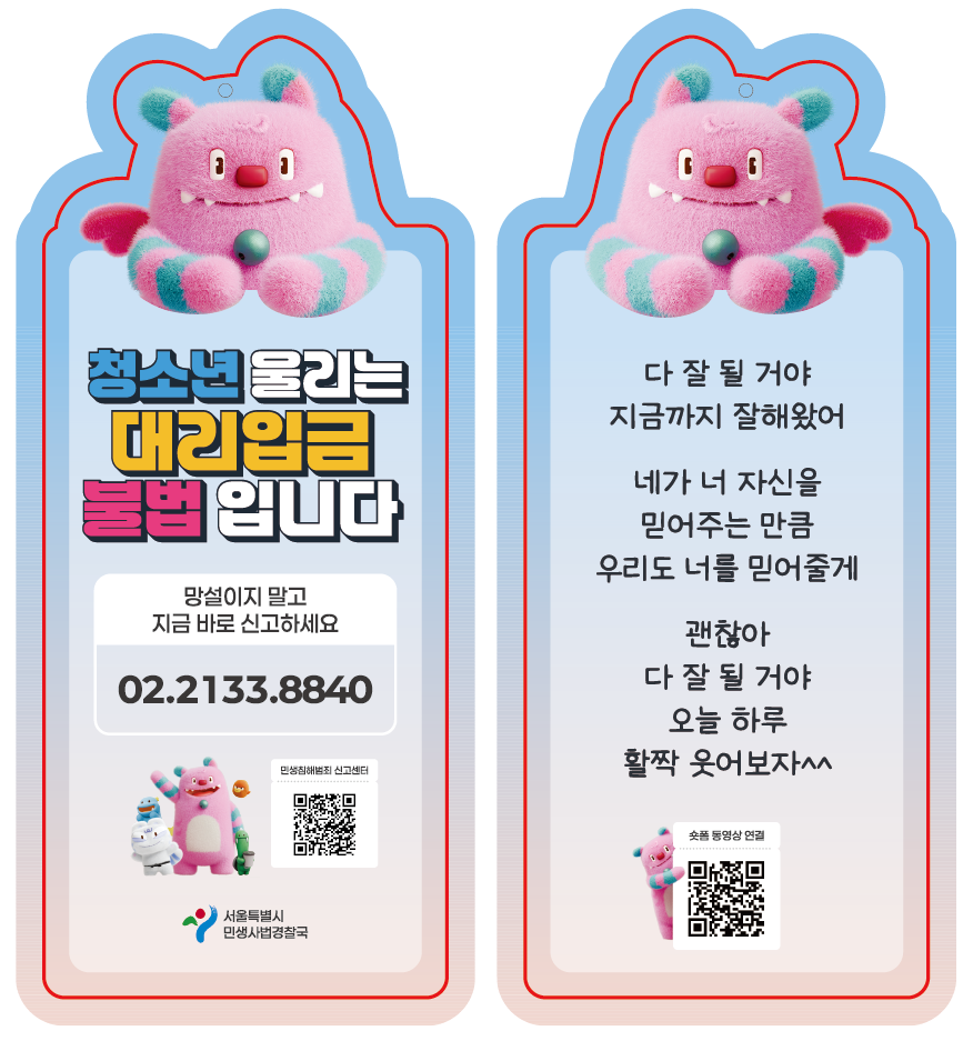 ¼: ¸Â½À´Ï´Ù. ±×·¡¼ ¼¿ï½Ã´Â 3°³ ¼ö»ç¹ÝÀ» Æí¼ºÇØ ¼Ò¼È¹Ìµð¾î¿¡¼ ¹Ýº¹ÀûÀ¸·Î ´ë¸®ÀÔ±ÝÀ» ±¤°íÇÏ´Â °èÁ¤µéÀ» ÁýÁß ÃßÀûÇϰí ÀÖ½À´Ï´Ù. ¶ÇÇÑ '´ëÆ÷ų·¯' ½Ã½ºÅÛÀ» Ȱ¿ëÇØ¼ ºÒ¹ý ±¤°í ÀüȹøÈ£¸¦ ½Ç½Ã°£À¸·Î ¸ð´ÏÅ͸µÇÏ°í ½Å¼ÓÇÏ°Ô Â÷´ÜÇÒ °èȹÀÔ´Ï´Ù. Ȥ½Ã¶óµµ ÁÖº¯¿¡ ÀÌ·± ÇÇÇØ¸¦ °Þ°í Àִ û¼Ò³âÀÌ ÀÖ´Ù¸é ´Ù»êÄÝÀç´ÜÀ̳ª ¼¿ï½º¸¶Æ®ºÒÆí½Å°í ¾ÛÀ¸·Î ²À ½Å°íÇϽñ⠹ٶø´Ï´Ù.