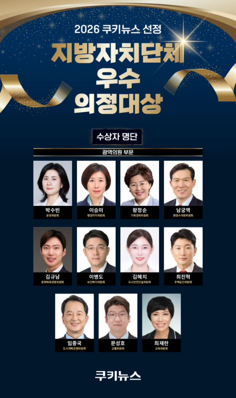 ¿ÕÁ¤¼ø ¼¿ï½ÃÀÇ¿ø(´õºÒ¾î¹ÎÁÖ´ç, °ü¾Ç2)ÀÌ ÄíŰ´º½º°¡ ¼±Á¤ÇÑ ¡®2026 Áö¹æÀÚÄ¡´Üü ¿ì¼öÀÇÁ¤´ë»ó¡¯ ±¤¿ªÀÇ¿ø ºÎ¹® ¼ö»óÀÚ·Î À̸§À» ¿Ã·È´Ù.