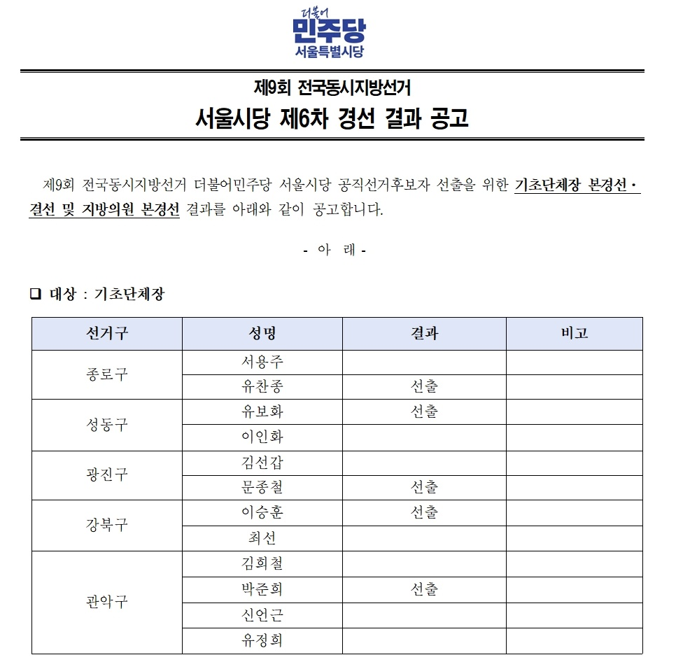 ´õºÒ¾î¹ÎÁÖ´ç ¼¿ï½Ã´çÀº ¹ã 10½Ã 15ºÐ ȨÆäÀÌÁö °øÁö»çÇ×À» ÅëÇØ ¼¿ï½Ã´ç Á¦6Â÷ °æ¼± °á°ú °øÁö¸¦ ÅëÇØ È®Á¤ »ç½ÇÀ» ¾Ë·È´Ù.