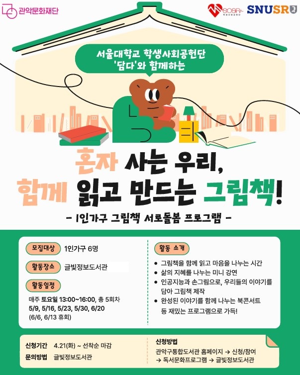 ¼: ³×, À̹ø¿£ 1ÀÎ °¡±¸¸¦ À§ÇÑ µû¶æÇÑ ¼Ò½ÄÀÔ´Ï´Ù. ±ÛºûÁ¤º¸µµ¼°ü¿¡¼ ¼¿ï´ëÇб³ Çлý»çȸ°øÇå´Ü ¡®´ã´Ù¡¯¿Í ÇÔ²² '1Àΰ¡±¸ ±×¸²Ã¥ ¼·Îµ¹º½ ÇÁ·Î±×·¥' Âü¿©ÀÚ¸¦ ¸ðÁýÇÕ´Ï´Ù.